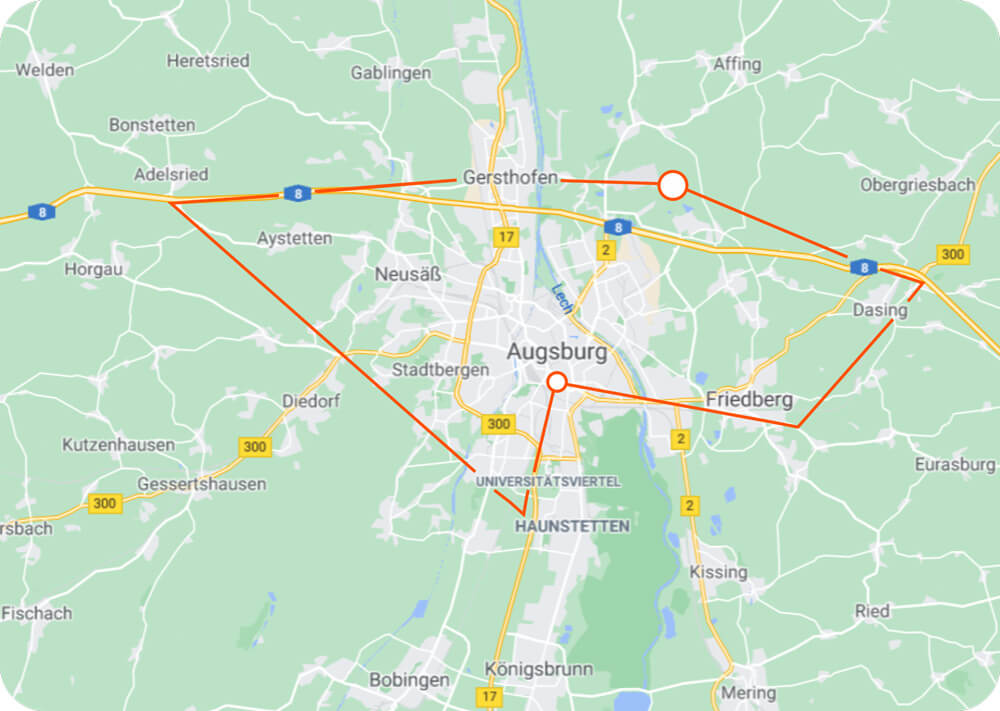 Nach dem Start am Flughafen Augsburg fliegen wir südwestlich über das Naherholungsgebiet Autobahnsee und Kaisersee, bevor wir Lechhausen erreichen, wo bedeutende Unternehmen wie die Kuka AG ansässig sind.