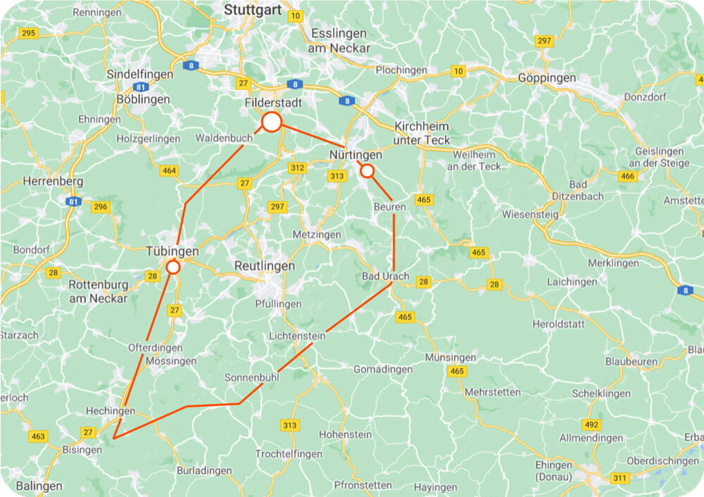 Bald liegt uns Tübingen zu Füßen: enge Gassen, Fachwerkhäuser, der Hölderlinturm am Neckar und das markante Schloss Hohentübingen auf seinem Sporn. Weiter südlich erhebt sich majestätisch die Burg Hohenzollern, Stammsitz des preußischen Königshauses – einst als „Krone aller Burgen in Schwaben“ gerühmt.