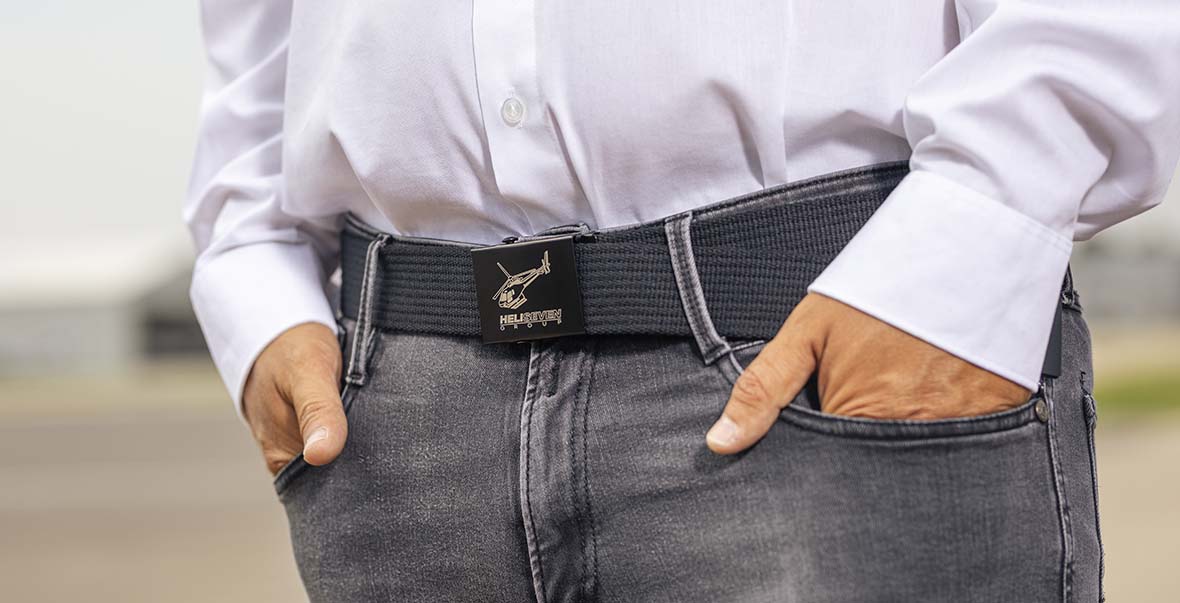 Dieser robuste und größenverstellbare Gürtel sorgt garantiert für einen perfekten Sitz. Die Metallschnalle ermöglicht ein stufenloses Einstellen in jede erdenkliche Größe. Auf der Schnalle wurde mit präziser Lasertechnik sowohl das Helikoptermodell AS350 als auch das Logo der HELISEVEN-GROUP eingearbeitet.