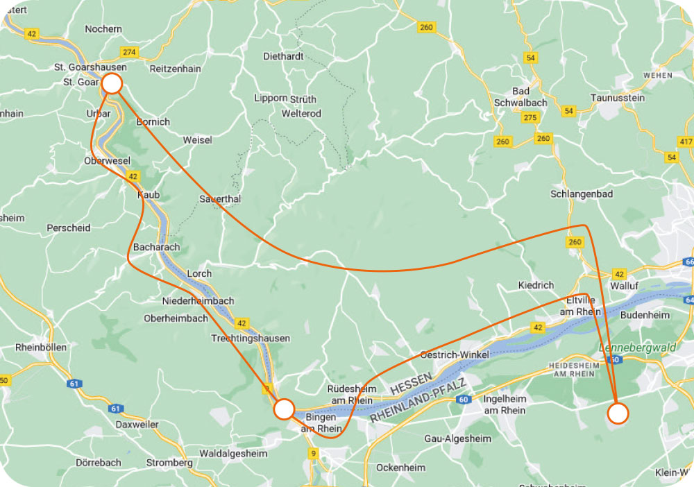 Vom Flugplatz Mainz-Finthen aus fliegen wir nordwärts in den Rheingau. Entlang des Rheins geht es bis Bingen, dabei überfliegen wir Eltville, Hattenheim, Oestrich-Winkel, Geisenheim und Rüdesheim. Von Bingen aus bietet sich ein schöner Blick auf das Rheintal, das Niederwalddenkmal und die Burg Ehrenfels.