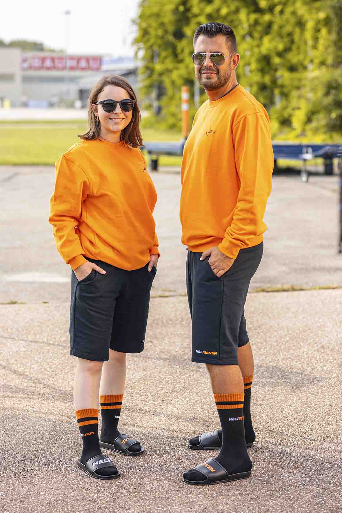 Passend zu unseren Hoodies bieten wir unsere Shorts an. Sie sind leger geschnitten, haben Einschubtaschen und einen weitenverstellbaren Bund mit Kordelzug. Das langlebige Baumwoll-Polyester-Gemisch sorgt hierbei für ein komfortables Tragegefühl. Die Bestickung HELISEVEN auf dem linken Hosenbein in orange-weiß hebt sich perfekt von der schwarzen Hose ab und sorgt so für den gewissen Touch. Kombinieren lässt sich die schwarze Shorts perfekt mit unserem orangefarbenen Sweatshirt und den schwarzen Hoodies!