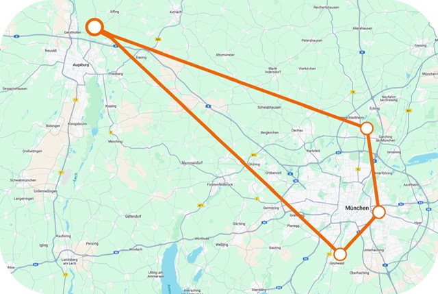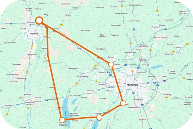 Nach dem Start am Flughafen Augsburg fliegen wir südwestlich über das Naherholungsgebiet Autobahnsee und Kaisersee, bevor wir Lechhausen erreichen, wo bedeutende Unternehmen wie die Kuka AG ansässig sind.